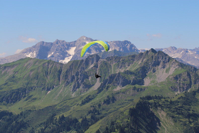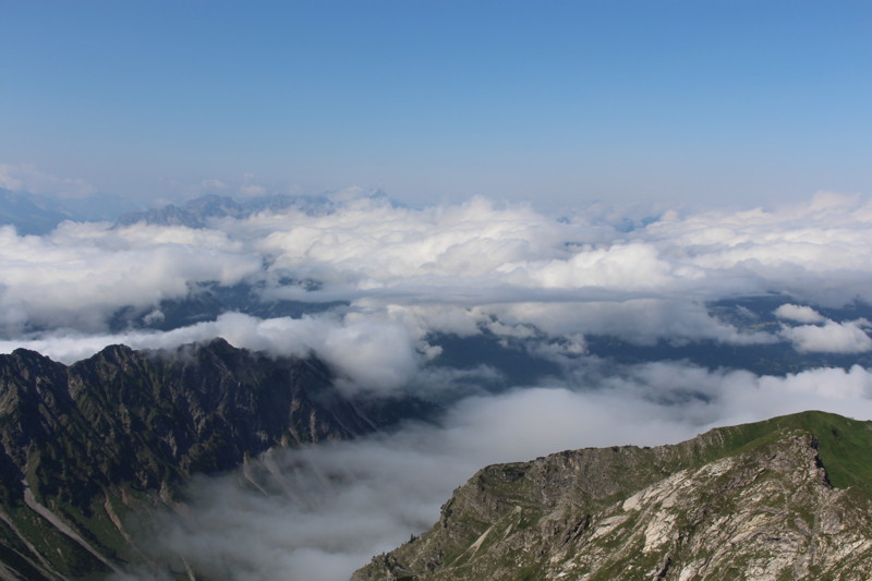 Das Nebelhorn machte seinem Namen dann alle Ehre: Nebel! Dies hatte aber den Vorteil, dass wir ohne Schlange sofort in die Kabine konnten und dass meine Frau auch keine Probleme mit der Höhe hatte. Man konnte noch nicht mal die vorherige Kabine sehen. Und dann kam die Bergstation Höfatsblick – und der Nebel war weg. Jetzt ging es schnell nach oben auf den eigentlichen Gipfel mit einem wunderbaren Blick bei Sonnenschein über die Berge und Wolken unterhalb. Einige Wochen später habe ich übrigens bei DMAX in der Dokumentation „Helden der Baustelle“ gesehen, wie die „neue“ Bahn von Oberstdorf zum Höfatsblick gebaut wurde.